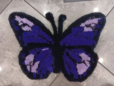 Tufted art, whether they are rugs, wall hangings, or other textiles, go through a three-step process: tufting, gluing, and shaving. The tufting process involves sending yarn through the primary backing, leaving the loops uncut in loop-pile rugs and snipped in cut-pile rugs.